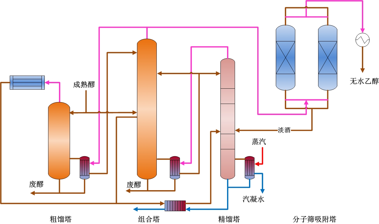 雙粗塔多效差壓流程配置粗餾塔、組合塔、精餾塔,其中,精餾塔采用一次蒸汽供熱,精餾塔塔頂酒汽供熱組合塔;組合塔塔頂酒汽供熱粗餾塔,其它熱源作為醪液多梯次預熱,泡點進料。